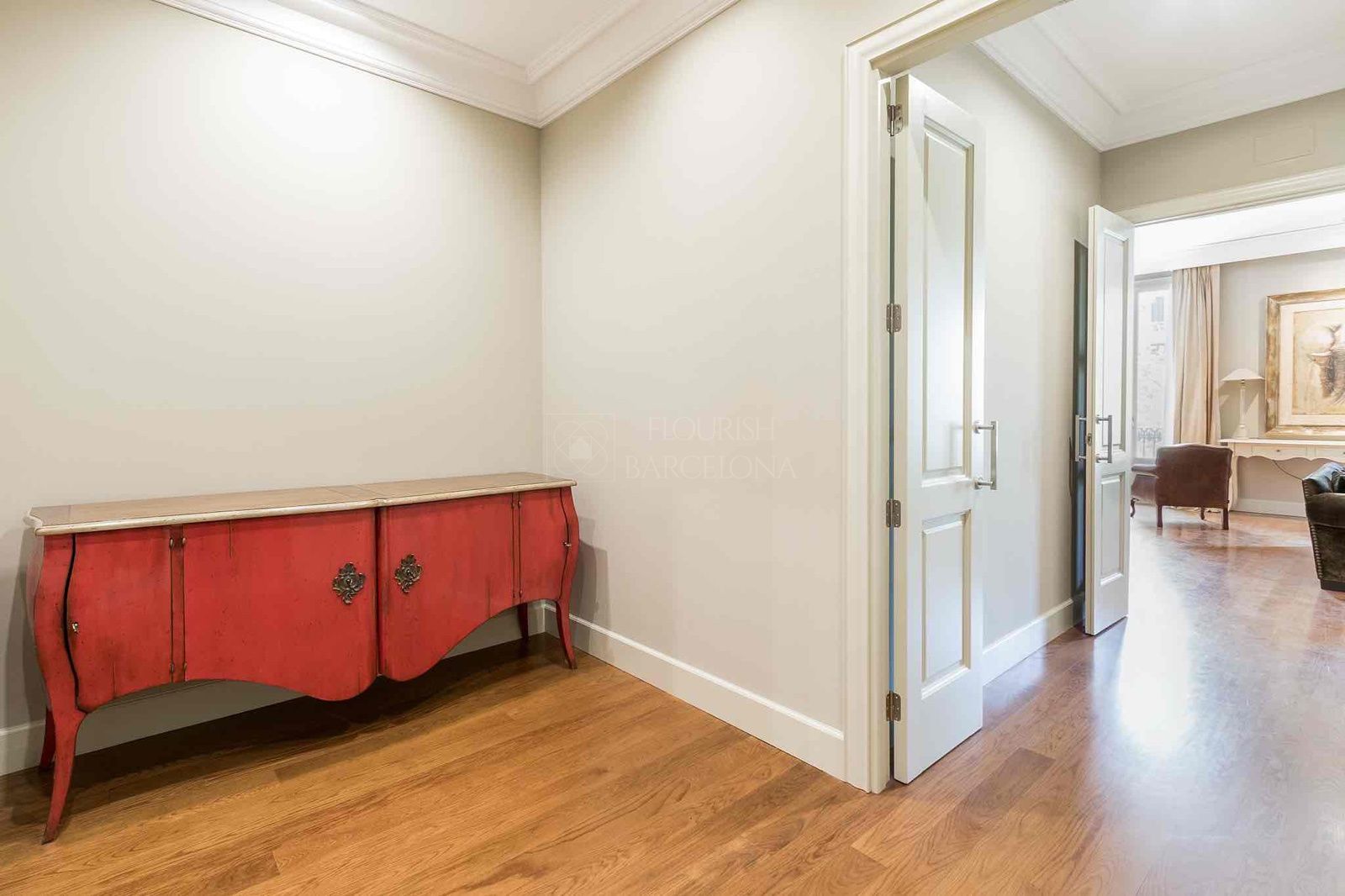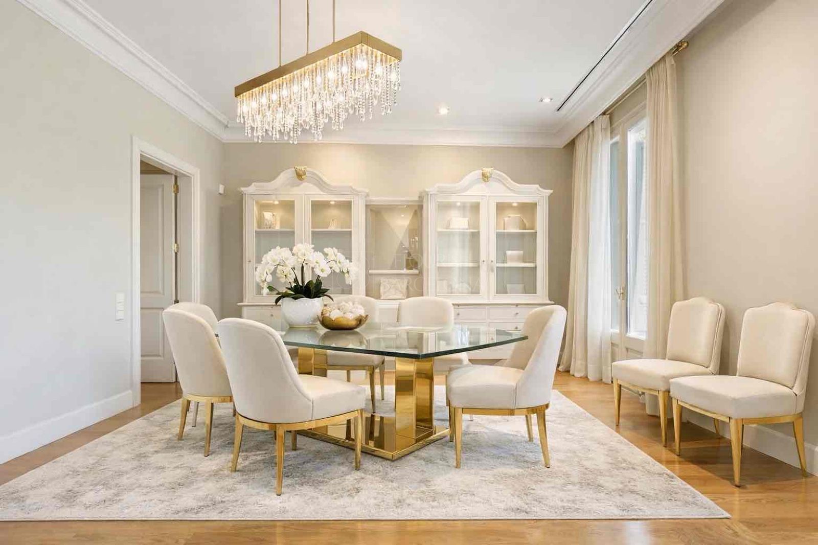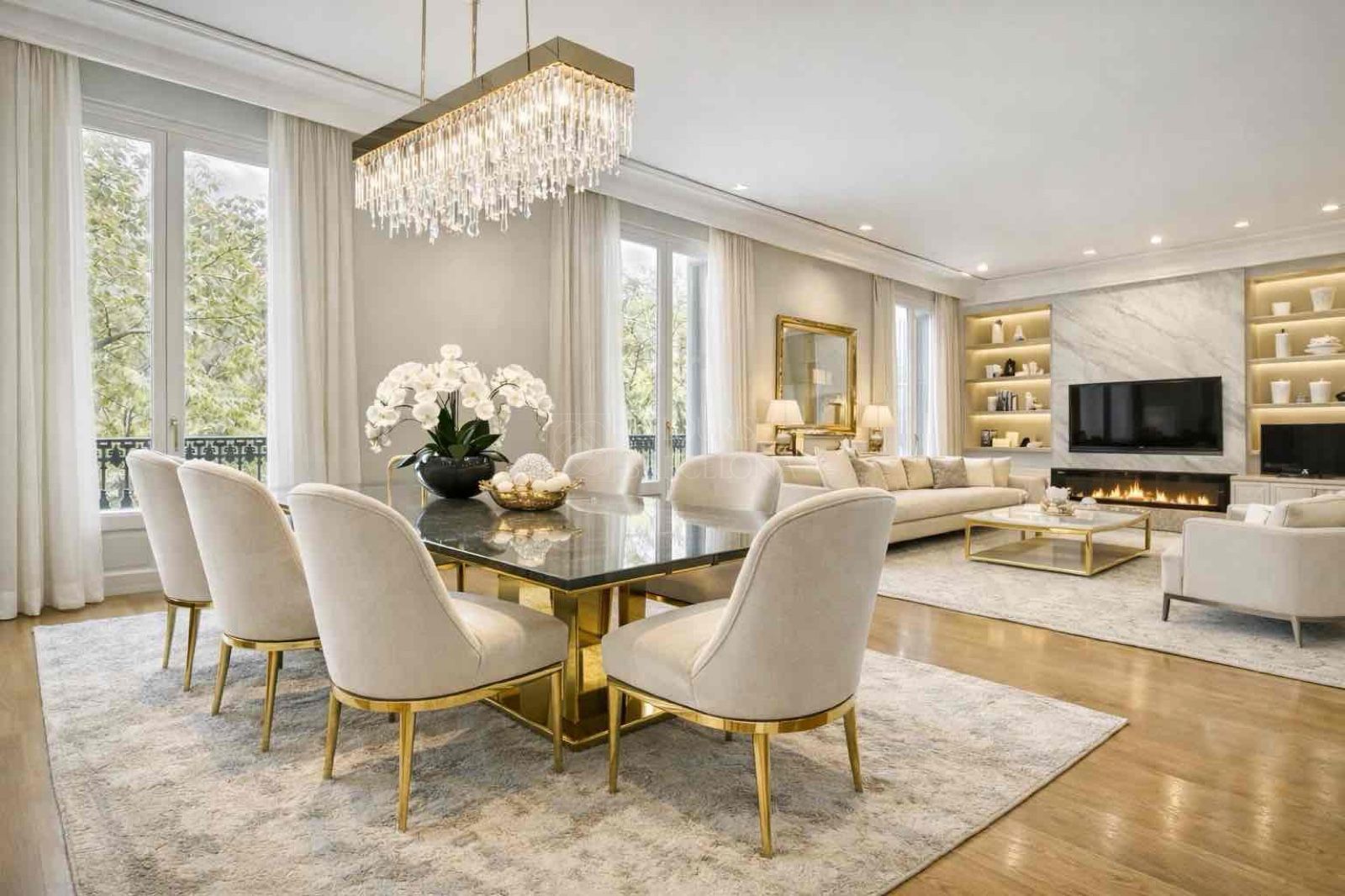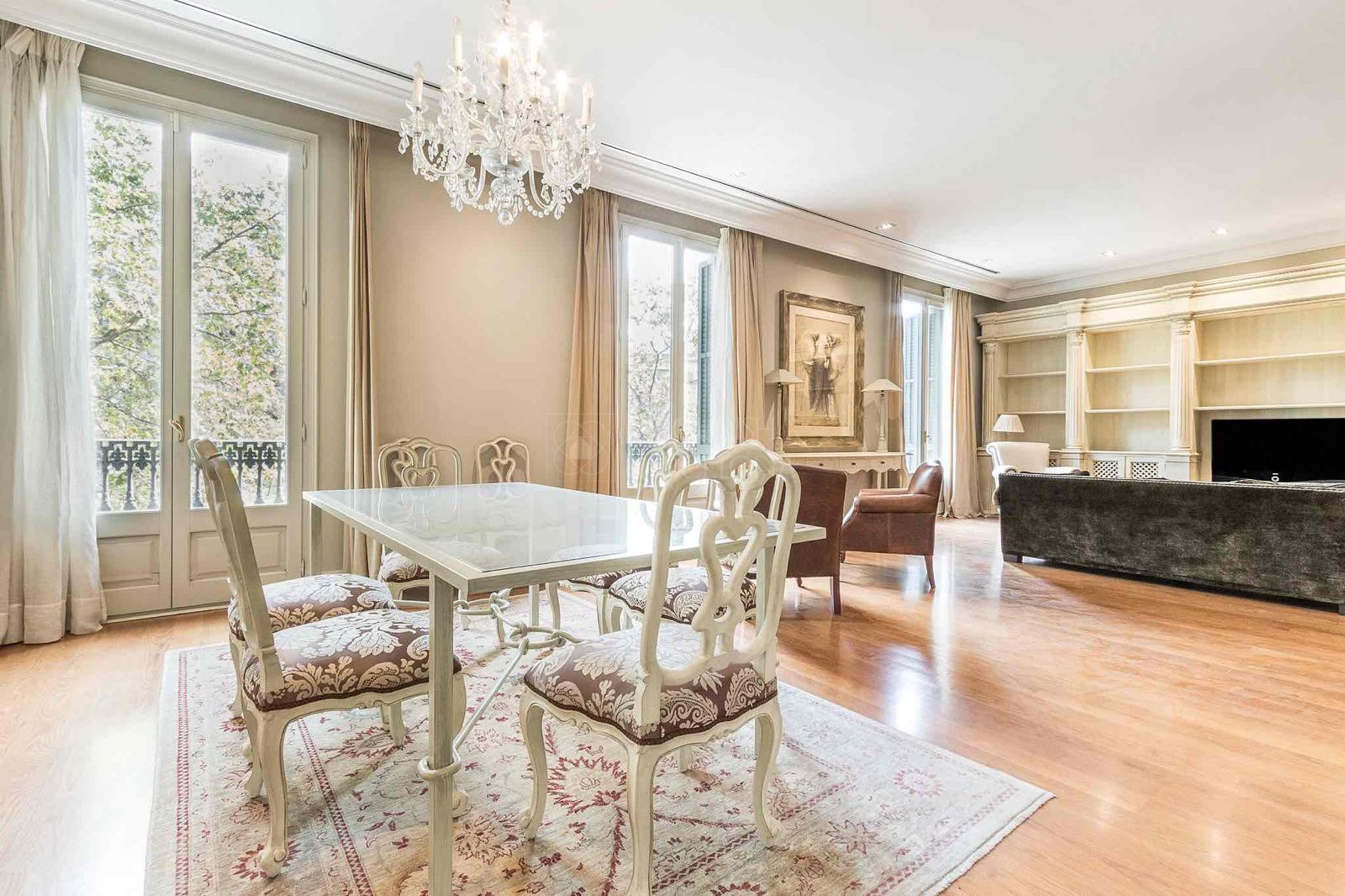 Desde el elegante recibidor se accede a una magnífica zona de día, donde un amplio y luminoso salón-comedor se abre a tres balcones sobre Paseo de Gracia, ofreciendo una experiencia única de luz, amplitud y vistas. La cocina independiente tipo office, generosa en espacio y almacenaje, está equipada con electrodomésticos de alta gama, perfecta tanto para el día a día como para recibir invitados. Completa esta zona un refinado aseo de cortesía.