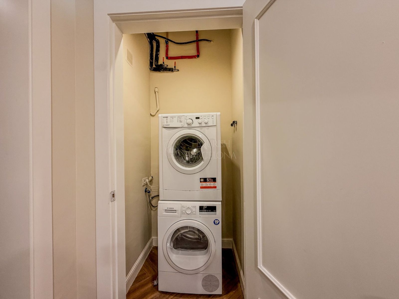 La cocina, integrada en el salón, es moderna y totalmente equipada con electrodomésticos de alta gama: vitrocerámica, horno, microondas, lavavajillas, nevera y una generosa capacidad de almacenamiento gracias a sus múltiples armarios. Además, dispone de una práctica zona de lavadero independiente con espacio adicional que puede utilizarse como trastero.