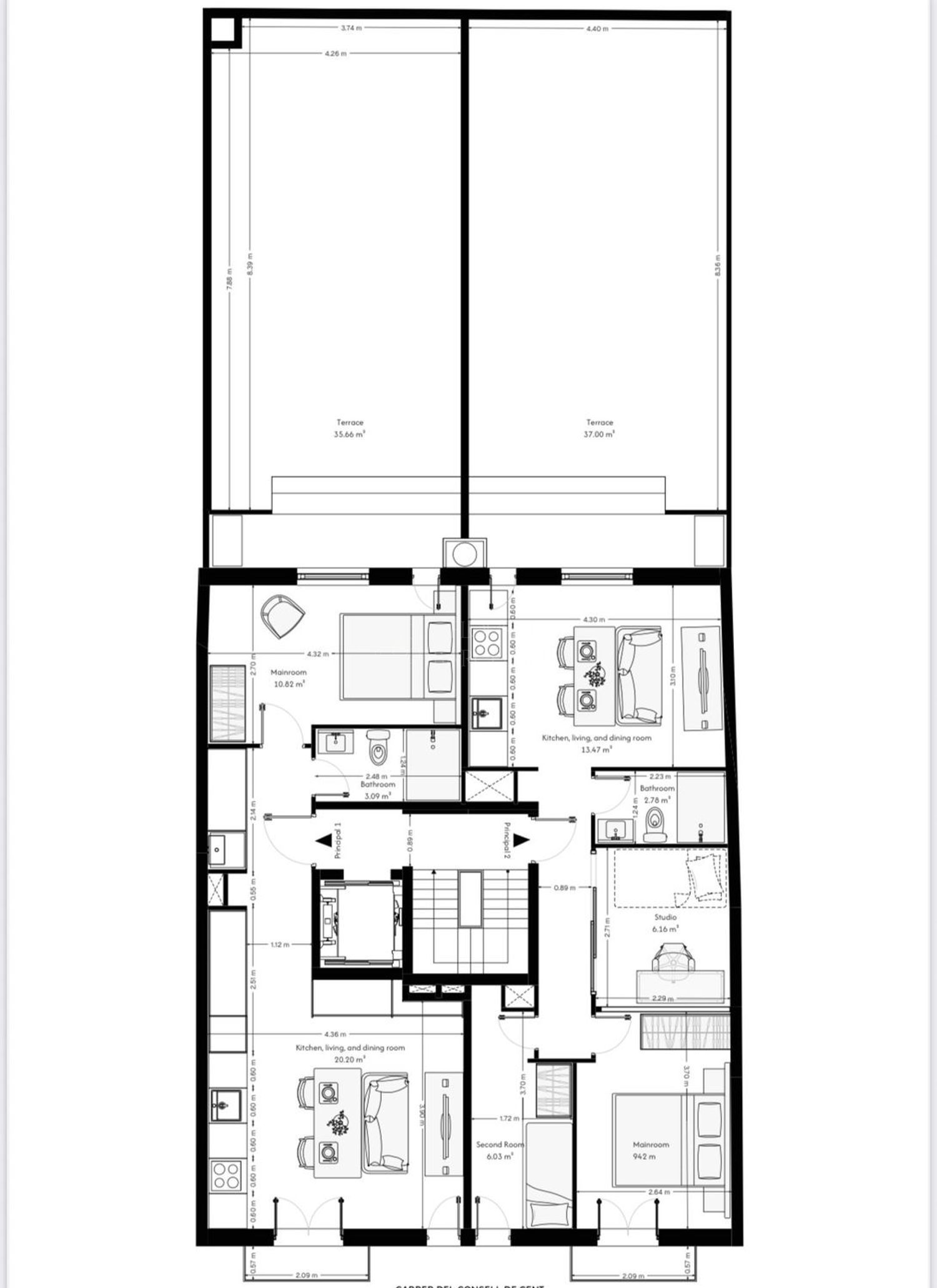 La joya de este piso es su impresionante terraza privada de 37 m², que amplía el espacio vital y permite disfrutar del aire libre. Además, puedes elegir entre una terraza a nivel, perfecta para integrar interior y exterior, o una terraza rooftop que te ofrece mayor privacidad y vistas espectaculares de la ciudad.