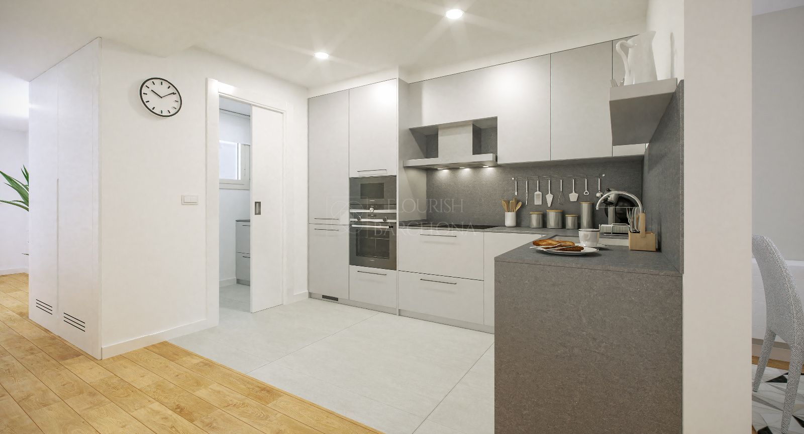 La cucina, completamente attrezzata con elettrodomestici di alta gamma, dispone di piani di lavoro in porcellanato e mobili di design. Qui, gli amanti della cucina potranno dare libero sfogo alla loro creatività.