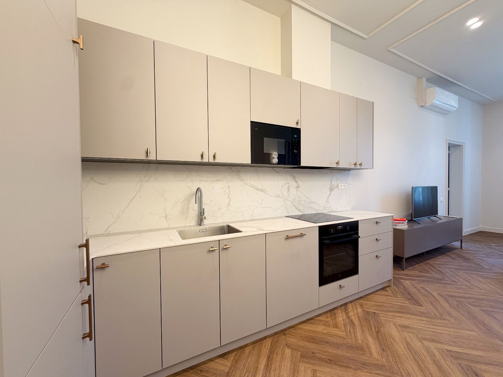 La cucina, integrata nel soggiorno, è moderna e completamente attrezzata con elettrodomestici di alta gamma: piano cottura in vetroceramica, forno, microonde, lavastoviglie, frigorifero e un’ampia capacità di stoccaggio grazie ai numerosi armadi.